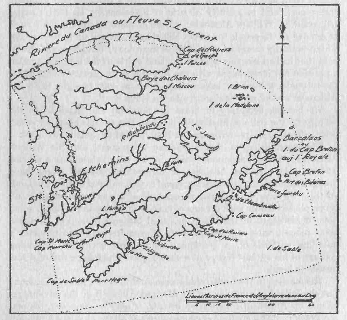 The lands and islands within the promontory of Cape Sable, westward to the roadstead of St. Mary, crossing its entrance or mouth of that roadstead to the St. Croix River, following to its remotest source, from that indefinite place, direct north to the St. Lawrence; eastward along the south shore of that river to Cape Gaspé, then south-southeast to the right of the Bacalaos Isles, onward to the mouth of the Gulf at the northernmost point of Cape Breton and from there southward to and including Sable Island, and to the starting point of that Cape.