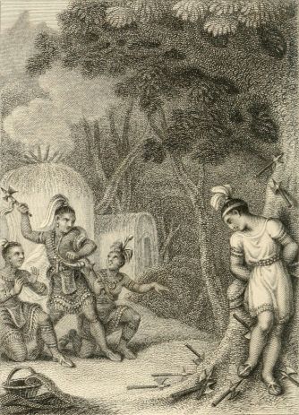One day, when poor Manuel had a little more time than usual, from Tustanuggi having taken out the horses himself, he ventured to a little thicket near the town, where the boys were wont to assemble. As soon as he was seen, the young fry set up a shout, but it was one of joy rather than welcome, for in a minute they all assembled round him, and instantly began to bind him, under the direction of Uswega; and he was given to understand that they were going to fix him in the opposite tree, in order to furnish them a mark at which to throw their hatchets or tomahawks. One of the boys told him good naturedly, that their object was to throw as near as possible to his body, but to avoid injuring him; but though this was better than his first expectation, he could not flatter himself that such young and unskilful hands could effect their purpose; and in a silent prayer he recommended his soul to God, and also begged a blessing on his far-distant parents.