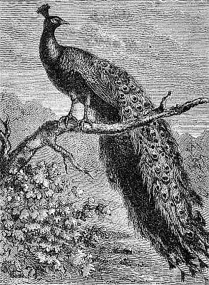 10. About the size of the turkey, the form of the peacock is lithe and graceful; and it carries a train longer than his body, covered with gauzy feathers of green, gold, bronze, and blue, all blended into the brightest and richest hues, as he raises and spreads and turns his tail to the sunlight. The eyes in the feathers of this overskirt are like those of the peacock-butterfly, which boys catch with their hats in summer-time. The peacock has been known to live as many as a hundred years.