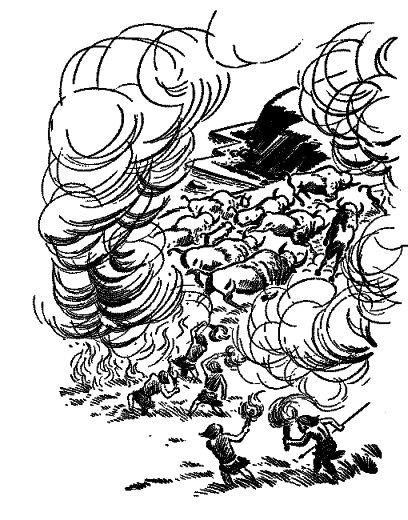 Leaping fire crawled up the grass where the hunters had first lighted it, and long tongues of flame licked hungrily out toward more grass. In a matter of seconds, behind the racing men, a curving line of fire sprang up and began to spread both ways. In a frenzy of excitement, Hawk leaped to his feet and shouted hoarsely. Then he was aware of the women and girl children beside him.