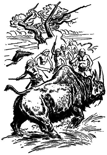Hawk, the Chief Spear-Maker, licked his lips. Though the tribe had seen much game in the past few days, most of it had been either too agile or too fierce for the hunters to attack. Even the mammoths had learned that only in numbers lay safety from human hunters, and aside from occasional small game the tribe had seen nothing except herds of big, dangerous beasts. It was suicide to attack a herd of mammoths, even with fire, for one such animal was capable of engaging every hunter in the tribe. But the giant bison were a different matter.