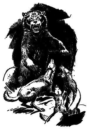 Furtive rustlings in the grass told of wild dogs that had come to tear at the slain warriors. Then came the hoarse cough of the saber-tooth, and the sound of the wild dogs disappeared. In the darkness, Hawk heard bones cracking and knew that, with morning, there would be nothing left of the hunters he had killed. Already they were filling the lean belly of the big cat. Hawk lay down to sleep fitfully.