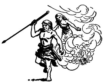 Clinging to the basket of water, Hawk ran desperately. He had been discovered, and there was no more need for subterfuge. Even as he ran he made ready to hurl his spear, for the enemy was between him and the cave. He would have to fight, but he would do it in his own way. As soon as he could see the first hunter outlined against the glow of the fire, Hawk stopped suddenly and hurled his spear.