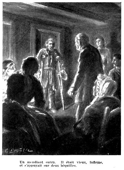 Et comme j'allais m'agenouiller, l'âme serrée par une angoisse amère, la porte aux deux battants rouges, par où j'étais entré, s'ouvrit de nouveau, et le doigt implacable me fit signe de sortir.