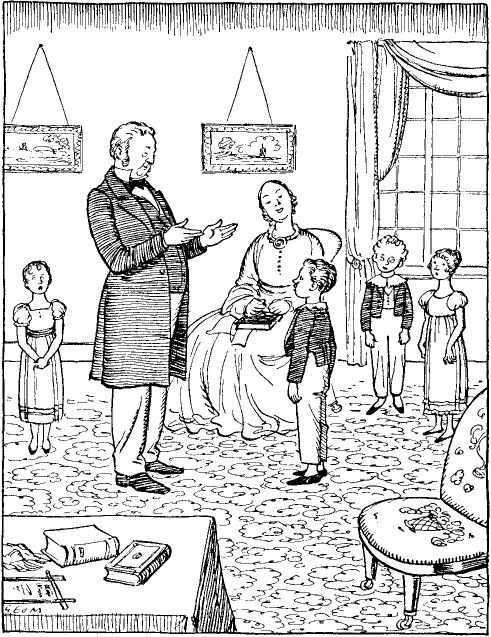 'Come, children,' said Mrs. Birdikin, entering the breakfast-parlour where the four young Birdikins were plying their tasks under the supervision of Miss Smith, 'your good Papa is now able to resume walking exercise and wishes that you should all accompany him on this fine morning, if Miss Smith will kindly consent to release you half an hour earlier than customary.'