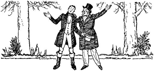 Arrived at the entrance to the Earl's mansion, Mr. and Mrs. Birdikin alighted, and, followed by the children, entered the stately precincts, there to be regaled with such refreshment as was fitting for the occasion. Mr. Birdikin was gratified to observe the children instantly seized upon by the Viscount Firebolt, the Honourable John, and the Lady Mary, for he felt that this exhibition of intimacy between his own offspring and that of his host could not but impress those of his neighbours who were witnesses of it. The Earl himself, a handsome and manly figure in his scarlet coat, came forward to greet him, and requested him, in humorous fashion, to take something to keep out the draught. Mr. Birdikin was about to engage him in a serious conversation about the Corn Laws, which were then exercising the minds of landowners, but he turned aside to greet others of his guests, and what was Mr. Birdikin's surprise to see that these were none other than Mr. Clott, the ironmonger, Mrs. Clott, and her niece, Miss Smith.
