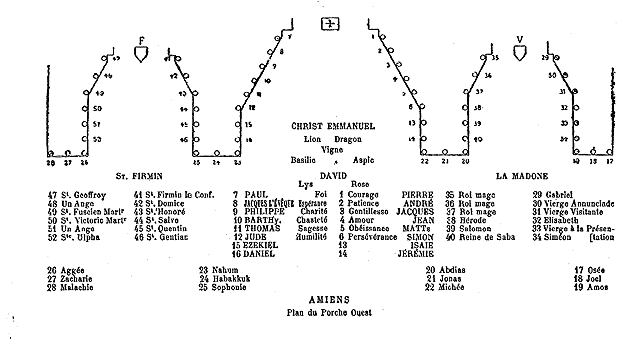 Au milieu est la statue du Christ qui est non au sens figuré, mais au sens propre, la pierre angulaire de l'édifice. A sa gauche (c'est-à-dire à droite pour nous qui en regardant le porche faisons face au Christ, mais nous emploierons les mots gauche et droite par rapport à la statue du Christ) six apôtres: près de lui Pierre, puis s'éloignant de lui, Jacques le Majeur, Jean, Mathieu, Simon. A sa droite Paul, puis Jacques l'évêque, Philippe, Barthélemy, Thomas et Jude 14. A la suite des apôtres sont les quatre grands prophètes. Après Simon, Isaïe et Jérémie; après Jude, Ezéchiel et Daniel; puis, sur les trumeaux de la façade occidentale tout entière viennent les douze prophètes mineurs; trois sur chacun des quatre trumeaux, et, en commençant par le trumeau qui se trouve le plus à gauche: Osée, Jaël, Amos, Michée, Jonas, Abdias, Nahum, Habakuk, Sophonie, Aggée, Zacharie, Malachie. De sorte que la cathédrale, toujours au sens propre, repose sur le Christ et sur les prophètes qui l'ont prédit ainsi que sur les apôtres qui l'ont proclamé. Les prophètes du Christ et non ceux de Dieu le Père:
