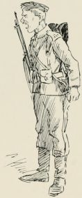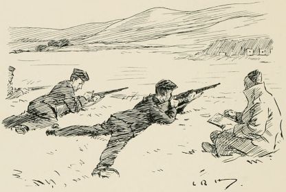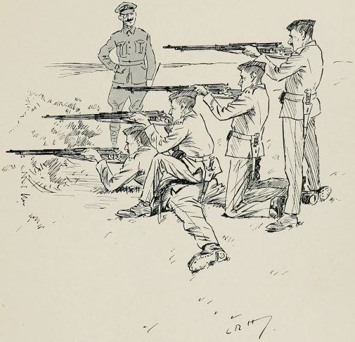 The boys stared furtively round the orderly-room, a little box partitioned off from the disused malt-house that served as drill shed. On the walls were highly-coloured posters, setting forth the various advantages of his Majesty's services, while in the corner a jumble of arms and equipment and a half-opened case of rifles caused them to nudge each other. A huge Sergeant was writing at a table covered with Army forms, drill books, and parade registers, amongst which a couple of cartridges attracted their attention.