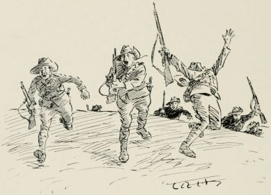 As we was out for the day only 'ad a sort o' bread an' water picnic instead of dinner, which we 'as when we gets back to camp. We was put through what they calls an attack drill after, but I didn't think much of it; started off with about twenty yards between you an' the next man, an' then as we advanced, they comes crowdin' up from be'ind till the firin' line were like a bloomin' football scrimmage, with about four different Battalions all atop o' one another, an' loosin' off right an' left whether they was in front or be'ind. "'Ere," I ses to Ted Parminter, "this aint no place for us, it's too bloomin' dangerous. I'm going to be a casualty." An' we drops be'ind. "Wot bally rot!" I 'eard one off'cer say, an' I quite agreed with 'im.