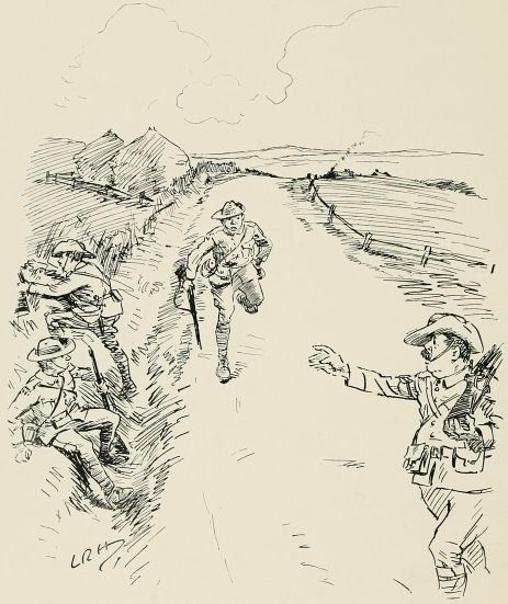 I daren't own up to the men that I haven't a notion where we are, but I haven't, and that's a fact. How this infernal path does wind about! "What's that, Corporal? Here's a sort of a road? This isn't a main road. Well, the men must have a rest, so——Where's the rest of the section? There aren't more than half of them here. Expect they've gone back the way they came?" I'm beginning to wish I had too.