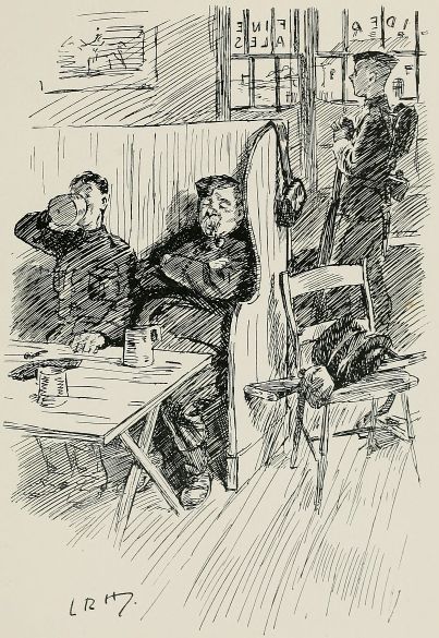"Corporal, there's no doubt that we've lost touch with the column. We must work our way along the road till we come across a house and find out where we are; unfortunately, I forgot to bring my map with me." At last! a cottage. The men had better rest while I make a few inquiries. "Oh, you're a stranger in these parts? But, my good woman, is there any place where I can find——The Red Lion? Where's that? Just down the road, where those soldiers are running to?" Well, I'm——!