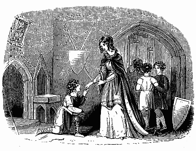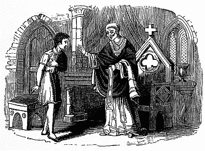 So on they rode, through good roads and bad, only pausing when their horses were spent, at a friendly convent by the way-side, for refreshment and dry garments. Here the queen would fain have left her son, under the care of the lady abbess, who offered to disguise him in female apparel; but he would not consent to be parted from his mother.