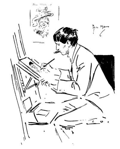 Their sea-journey back finished at Naples, and the Mays went thence to Rome. Here Phil set to work to justify his patron's liberality, but with all his study of the old masters he did not neglect the close observation of contemporary characters. Indeed, there can be no doubt that the world of his own day was May's best school, and the life about him offered a better training for an artist of his temperament than the works of the great painters of the past. Nevertheless Rome and its works of art and architecture impressed him deeply, and he expressed the fact in his own peculiar fashion when he wrote in a letter to his brother that ‘Be it ever so crumbly, there's no place like Rome.’ From Rome, after a short visit to London, he went to Paris, where he shared a studio and garden at Puteaux with Henry Thompson, a landscape painter. Thompson, whose portrait often appears in Phil May's drawings, afterwards edited the last seven of the Phil May Annuals. Among his other friends in Paris were William (later Sir William) Rothenstein, Charles Conder, and two Americans, both well-known illustrators, W. T. Smedley and C. S. Reinhardt.