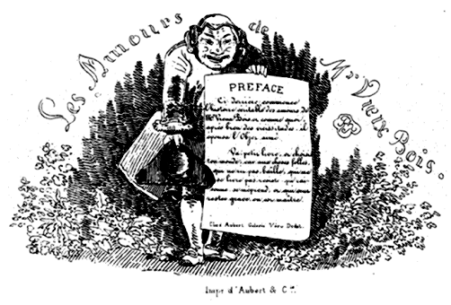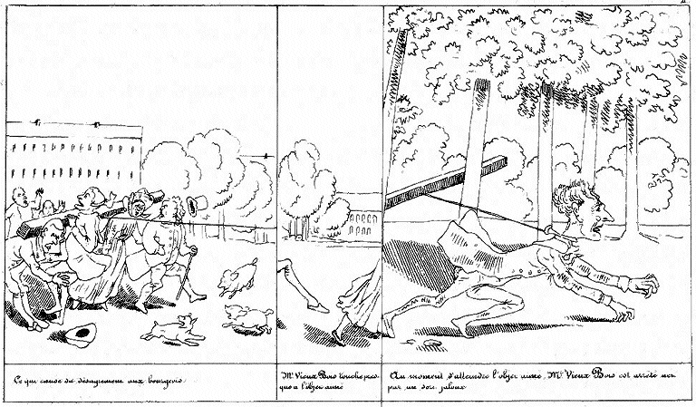 | Mr. Vieux-Bois, ayant eu du dessus, fait la demande aux parents, en présence de l'objet aimé. | Mr. Vieux Bois, accepté, rentre chez lui et s'y livre pendant trois heures à des sauts de joie. |