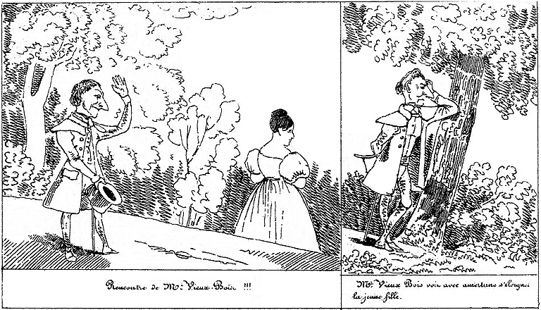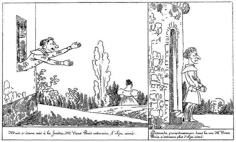 | Tout à coup, Mr. Vieux-Bois a l'ivresse d'apercevoir l'objet aimé à une croisée, de l'autre côté de la rue. | S'étant livré à un saut de joie bien excusable, Mr. Vieux-Bois enfonce la toiture et disparaît. |