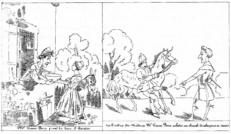 | Mr. Vieux-Bois prend le lait d'ânesse. | Sur l'ordre du médecin, Mr. Vieux-Bois achète une cheval arabe pour sa santé. |