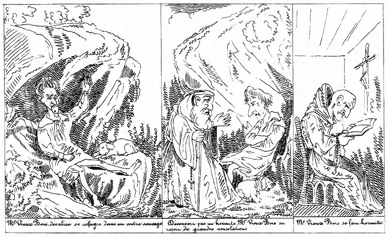 | Mr. Vieux-Bois, dévalisé, se réfugie dans un antre sauvage. | Découvert par un hermite, Mr Vieux-Bois en reçoit de grandes consolations. | Mr. Vieux-Bois se fait hermite. |
