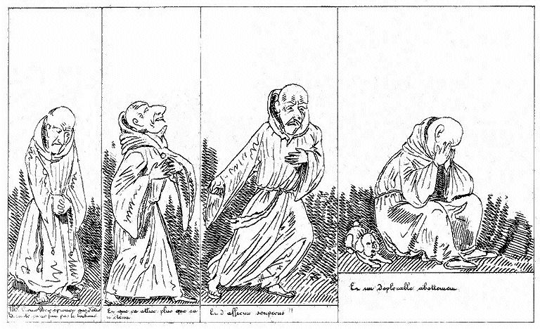| Les deux moines entendant un grand bruit derrière eux, sont très inquiets, et crient au secours de toute leur force. | Le rival qui s'était déjà précipité à moitié, entendant crier au secours s'empresse d'accourir et voyant de quoi il s'agit s'adjuge de nouveau l'objet aimé. |