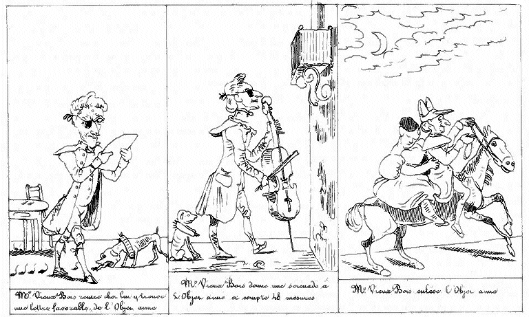 | Mr. Vieux Bois cherche à établir une correspondance avec l'objet aimé. | Les parents de l'objet aimé ayant abandonné leur appartement depuis leur grande frayeur, Mr. Vieux-Bois attend en vain une réponse depuis huit jours. | Au neuvième, Mr. Vieux-Bois a la joie de sentir un léger poids; dans son ivresse, il se flatte que c'est l'objet aimé lui-même. |