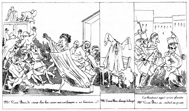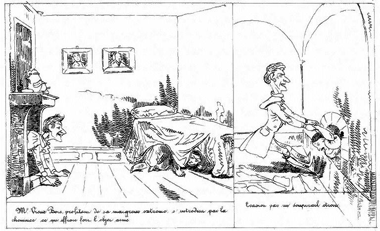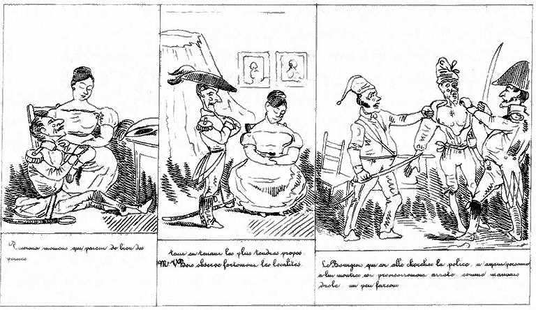 | Précieux moments qui payent de bien des peines. | Tout en tenant les plus tendres propos, Mr. Vieux-Bois observe fortement les localités. | Le Bourgeois qui est allé chercher la police, n'ayant personne à lui montrer, est provisoirement arrêté, comme mauvais drôle, un peu farceur. |