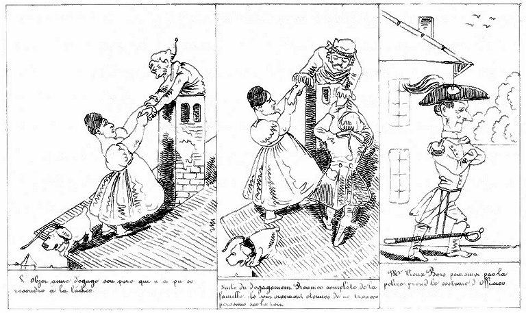 | L'objet aimé dégage son père qui n'a pu se résoudre à la lâcher. | Suite du dégagement. Réunion complète de la famille. Ils sont vivement étonnés de ne trouver personne sur le toit. | Mr. Vieux-Bois poursuivi par la police prend le costume d'officier. |