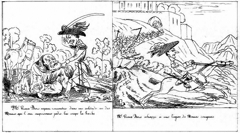 | Mr. Vieux-Bois ayant rencontré dans une solitude, un des moines qui l'ont emprisonné jadis, lui coupe la barbe. | Mr. Vieux-Bois échappe à une légion de moines vengeurs. |