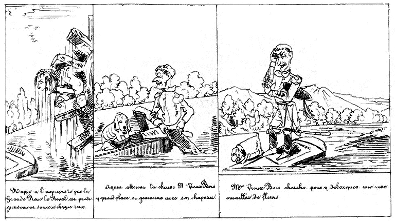 | Rage intime de Mr. Vieux-Bois qui parvenu sur les bords du fleuve voit flotter le rival en possession de la chaise. | Mr. Vieux-Bois n'hésite pas à plonger dans le fleuve pour nager à la poursuite de l'objet aimé. | Pendant que le rival s'abandonne à tout le charme du récit, il est porté par le fleuve du côté de la grande roue. |