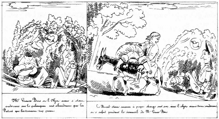 | Le rival s'étant endormi, l'âne mange beaucoup de foin, et Mr. Vieux-Bois commence à se dégager. Tourments de la jalousie. | Entièrement dégagé, Mr. Vieux-Bois charge sur l'âne l'objet aimé endormi et s'enfuit au plus vite. |