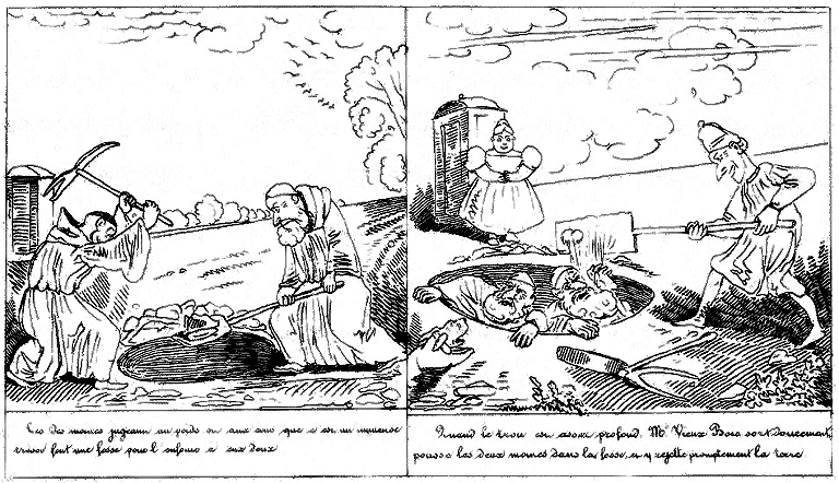 | Deux des moines jugeant au poids et aux écus que c'est un immense trésor font une fosse pour l'enfouir à eux deux. | Quant le trou est assez profond, Mr. Vieux-Bois sort doucement pousse les deux moines dans la fosse, et y rejette promptement la terre. |