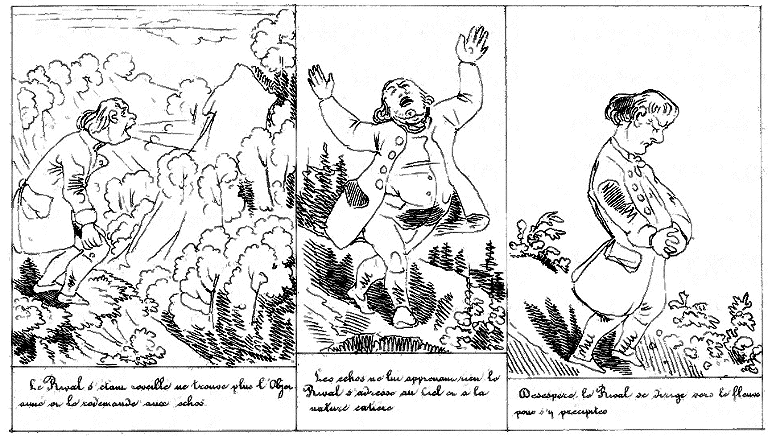 | Mr. Vieux-Bois change de linge. | Troisième rencontre, déclaration, soupir, espoir. | L'objet aimé s'éloigne, forte amertume. | Soupçons naissants. |
