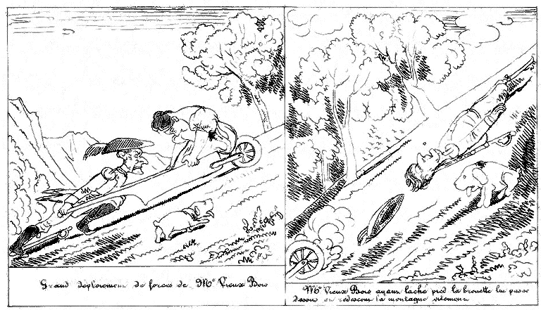 | Grand déploiement de forces de Mr. Vieux-Bois. | Mr. Vieux-Bois ayant lâché pied, la brouette lui passe dessus et redescend la montagne vitement. |