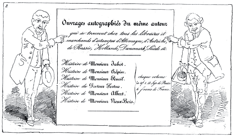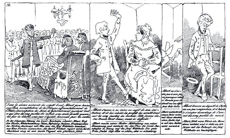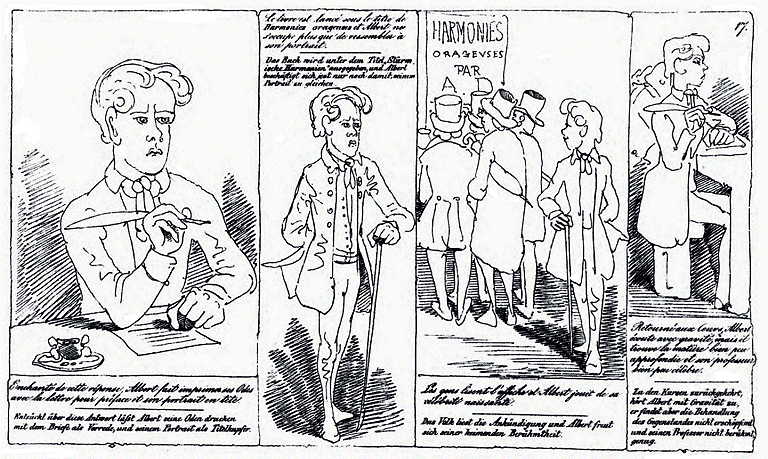 | Enchanté de cette réponse, Albert fait imprimer ses Odes avec la lettre pour préface et son portrait en tête. | Ce livre est lancé sous le titre de Harmonies orageuses et Albert ne s'occupe plus que de ressembler à son portrait. | Les gens lisent l'affiche et Albert jouit de sa célébrité naissante. | Retourné aux études, Albert écoute avec gravité, mais il trouve la matière bien peu approfondie et son professeur bien peu célèbre. |