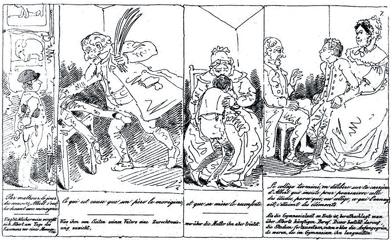 | Par malheur, le jour du concours, Albert s'oublie devant une ménagerie. | Ce qui est cause que son père le morigine, | et que sa mère le réconforte. | Le collège terminé, on délibère sur la carrière d'Albert qui insiste pour poursuivre celle des études, parce que, au collège, ce qui l'ennuyait, c'étaient les éléments. |