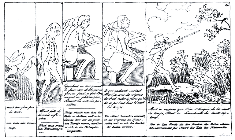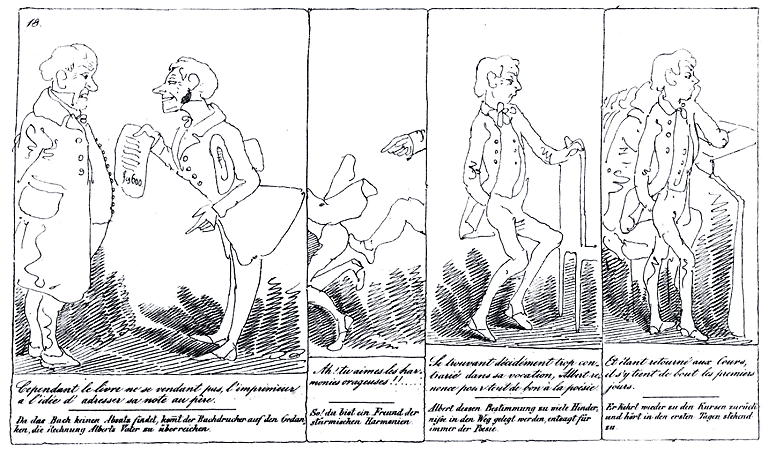 | Au troisième de la maison voisine, Albert insiste pour être introduit, et il fait antichambre pendant qu'on va prévenir monsieur. | Monsieur dont l'épouse est sur le point d'accoucher déplore qu'on lui fasse des visites dans un moment pareil. | Au premier mot de métaphysique pittoresque, monsieur entre en grande fureur. | Albert ayant reçu plusieurs contusions se dégoûte de l'état et il déménage. |