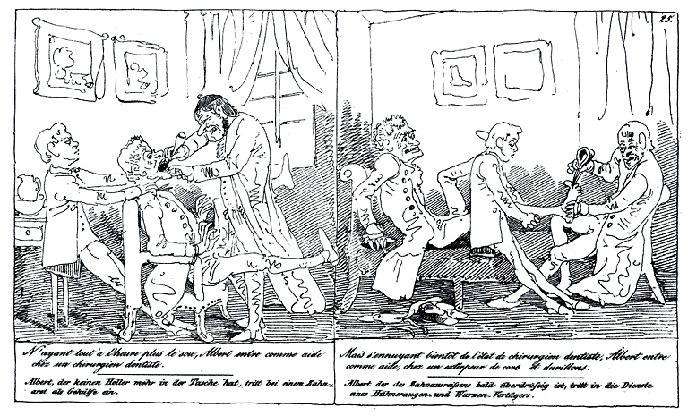 | N'ayant tout à l'heure plus le sou, Albert entre comme aide chez un chirurgien dentiste. | Mais s'ennuyant bientôt de l'état de chirurgien dentiste, Albert entre comme aide, chez un extirpeur de cors et durillons. |