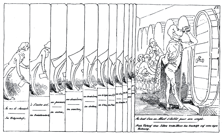 | Au bout d'un mois, Albert quitte son maître et extirpe pour son compte. | Par malheur, tous ses sujets étant venus à mourir du tétanos, Albert déménage. | Entré chez un négociant propriétaire à Bordeaux, Albert y tatille furtivement les vins, pour s'instruire. | Ayant fait de rapides progrès, Albert devient commis-voyageur en vins, et il assassine d'étage en étage. |