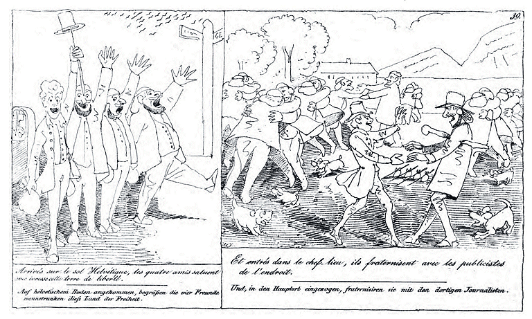 | Arrivés sur le sol Helvétique, les quatre amis saluent avec ivresse cette terre de liberté. | Et entrés dans le chef-lieu, ils fraternisent avec les publicistes de l'endroit. |