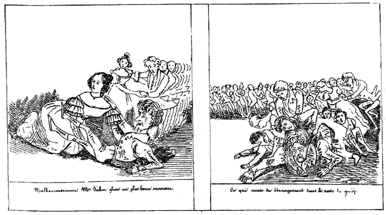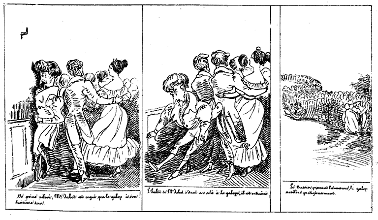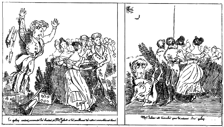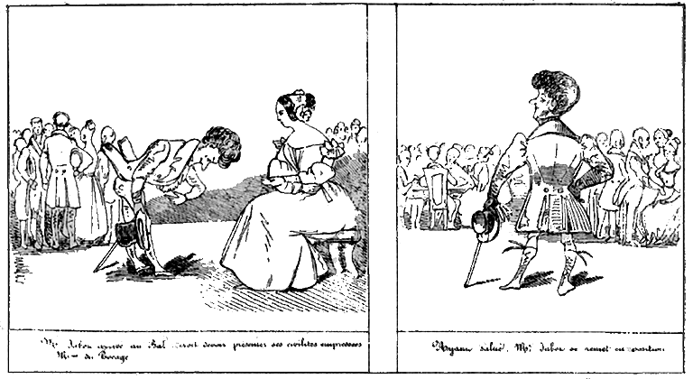 | Beau moment! Mr. Jabot fait faire à Milady un tour de salle. | Mr. Jabot croit devoir marquer à Milady une préférance délicate. Un lampion s'éteint et fume. | Aussitôt Mr Jabot s'empresse de rémédier à cette odeur importune. -- Le galop approche. |