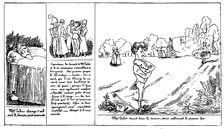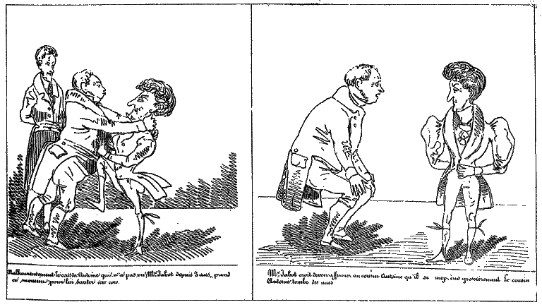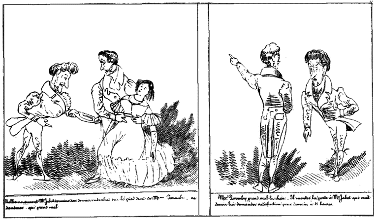 | Mr. Jabot change d'oeil vers 2 heures, après nécessité. | Cependant les seconds de Mr. Jabot et de ses adversaires s'assemblent de bon matin. Un premier propose le Pistolet. -- Arrêté. -- Un second, que l'on charge les armes avec deux boulettes de mie de pain, puisque l'honneur sera également satisfait. -- Arrêté comme juste et conforme à l'usage. -- Un troisième que l'on en prévienne les parties; afin de leur épargner une inquiétude inutile. -- Adopté à l'unanimité. | Mr. Jabot devant tirer le dernier, essuie noblement le premier feu. |