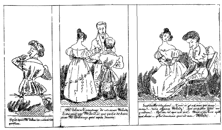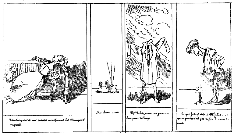 | Entendant parler de flamme amoureuse, la Marquise de Mirliflor juge qu'elle pourrait bien y être pour quelque chose. | Ayant senti la chaleur au dos, Mr. Jabot fait neuf fois le tour de sa chambre en criant: Je brûle!... je brûle!!! | La Marquise ne doute plus qu'elle n'ait plus inspiré une passion d'une violence extraordinaire. |