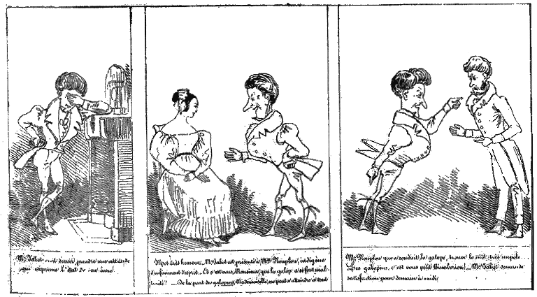 | Malheureusement Mr. Jabot termine son dernier entrechat sur le pied droit de Mme Josomby, sa danseuse, qui prend mal. | Mr. Josomby prend mal la chose. -- Il montre la porte à Mr. Jabot qui croit devoir lui demander satisfaction pour demain à 11 heures. |