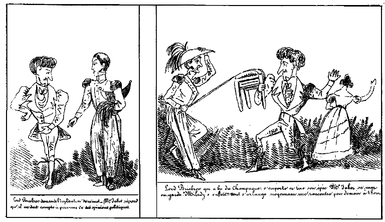 | Lord Bricbroc demande l'explication de ce mot. -- Mr. Jabot répond qu'il ne doit compte à personne de ses opinions politiques. | Lord Bricbroc qui a bu du Champagne, s'emporte et tire son épée. Mr Jabot se met en garde. Milady s'enfuit. Tout s'arrange moyennant une rencontre pour demain à 1 heure. |