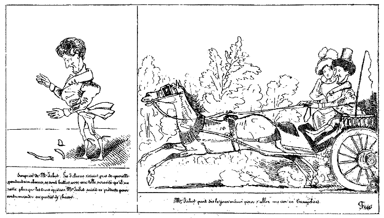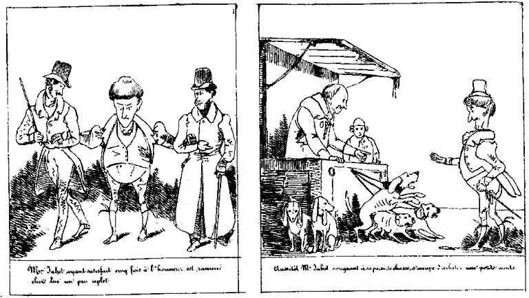 | Mr. Jabot ayant satisfait cinq fois à l'honneur, est ramené chez lui un peu replet. | Aussitôt Mr. Jabot, songeant à sa partie de chasse, s'occupe d'acheter une petite meute. |