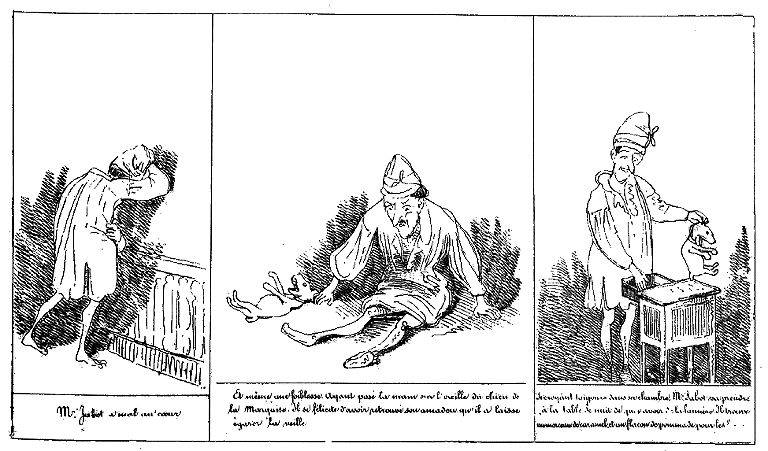 La Marquise profondément touchée, ayant crié oui!! crainte de malheur. D'un saut Mr. Jabot est à ses pieds. |