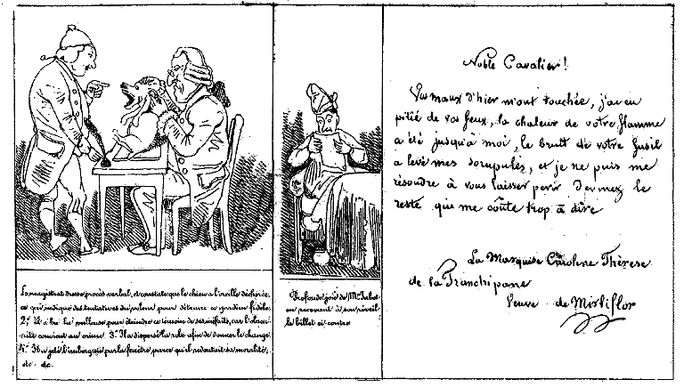 Noble Cavalier! Vos maux d'hier m'ont touchée, j'ai eu pitié de vos feux, la chaleur de votre flamme a été jusqu'à moi, le bruit de votre fusil a levé mes scrupules, et je ne puis me résoudre à vous laisser périr. Devinez le reste qui me coûte trop à dire. La Marquise Caroline Thérèse de la Franchipane, Veuve de Mirliflor. |