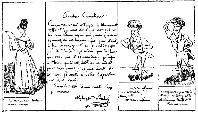 Noble Dame! Vos beaux yeux m'ont incendié la prunelle, et je brûle, pour vous, d'une flamme inextinguible. Je mets à vos jolis pieds mon nom, ma fortune et ma main, avec tous les sentimens d'un homme comme il faut, et les avantages d'un amant bien élevé. Un oui! ou je meurs consumé. Alphonse de Jabot. |