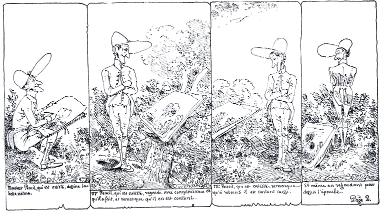 | Mr. Pencil, qui est artiste, dessine la belle nature. | Mr. Pencil, qui est artiste, regarde avec complaisance ce qu'il a fait, et remarque qu'il en est content. | Mr. Pencil, qui est artiste, remarque qu'à rebours il est content aussi. | Et même en regardant par dessus l'épaule. |