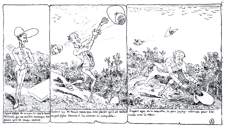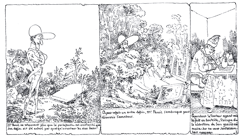 | Mr. Pencil ne retrouvant plus que le portefeuille est enchanté que son dessin ait été enlevé par quelqu'amateur du vrai beau. | Ayant refait un autre dessin, Mr. Pencil s'embusque pour découvrir l'amateur. | Cependant le docteur ayant mis les faits en bouteille, s'occupe de la rédaction de son grand mémoire sur un vent souterrain tout nouveau. |