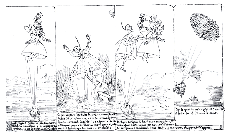 | Le bourgeois ayant imprudemment lâché le parapluie, a le bonheur de tomber sur les épaules de Mde. Jolibois. | Ce que voyant, (car hélas la passion aveugle) Mr Jolibois se persuade que c'est sa femme qui enlève son amant. Aussitôt il se dépouille de ses vêtements pour chercher la mort dans les flots, mais il trouve que la chose est malaisée. | Porté par le zéphir à hauteur convenable, Mr. Jolibois (car hélas la passion aveugle) s'efforce de rompre ces criminels liens, mais il manque de point d'appui. | Après quoi le petit zéphir s'amuse à faire tourbillonner le tout. |