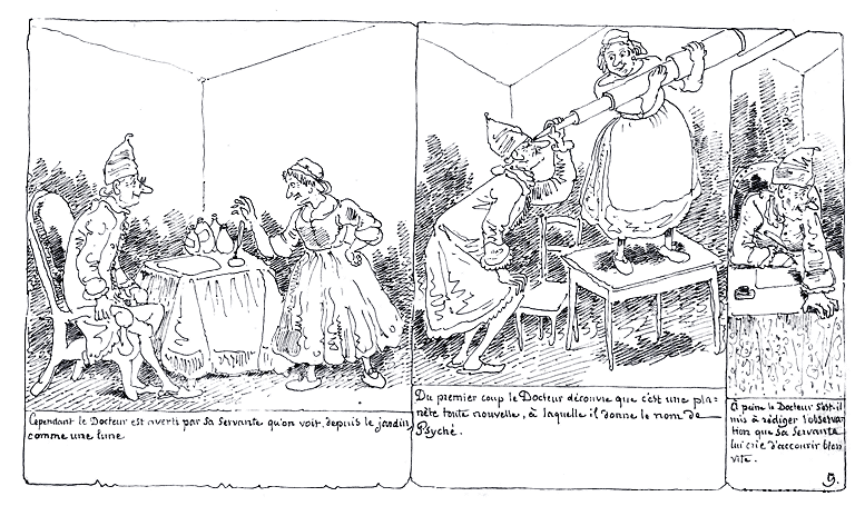 | Cependant le Docteur est averti par sa servante qu'on voit, depuis le jardin, comme une lune. | Du premier coup le Docteur découvre que c'est une planète toute nouvelle, à laquelle il donne le nom de Psyché. | A peine le Docteur s'est-il mis à rédiger l'observation que sa servante lui crie d'accourir bien vite. |